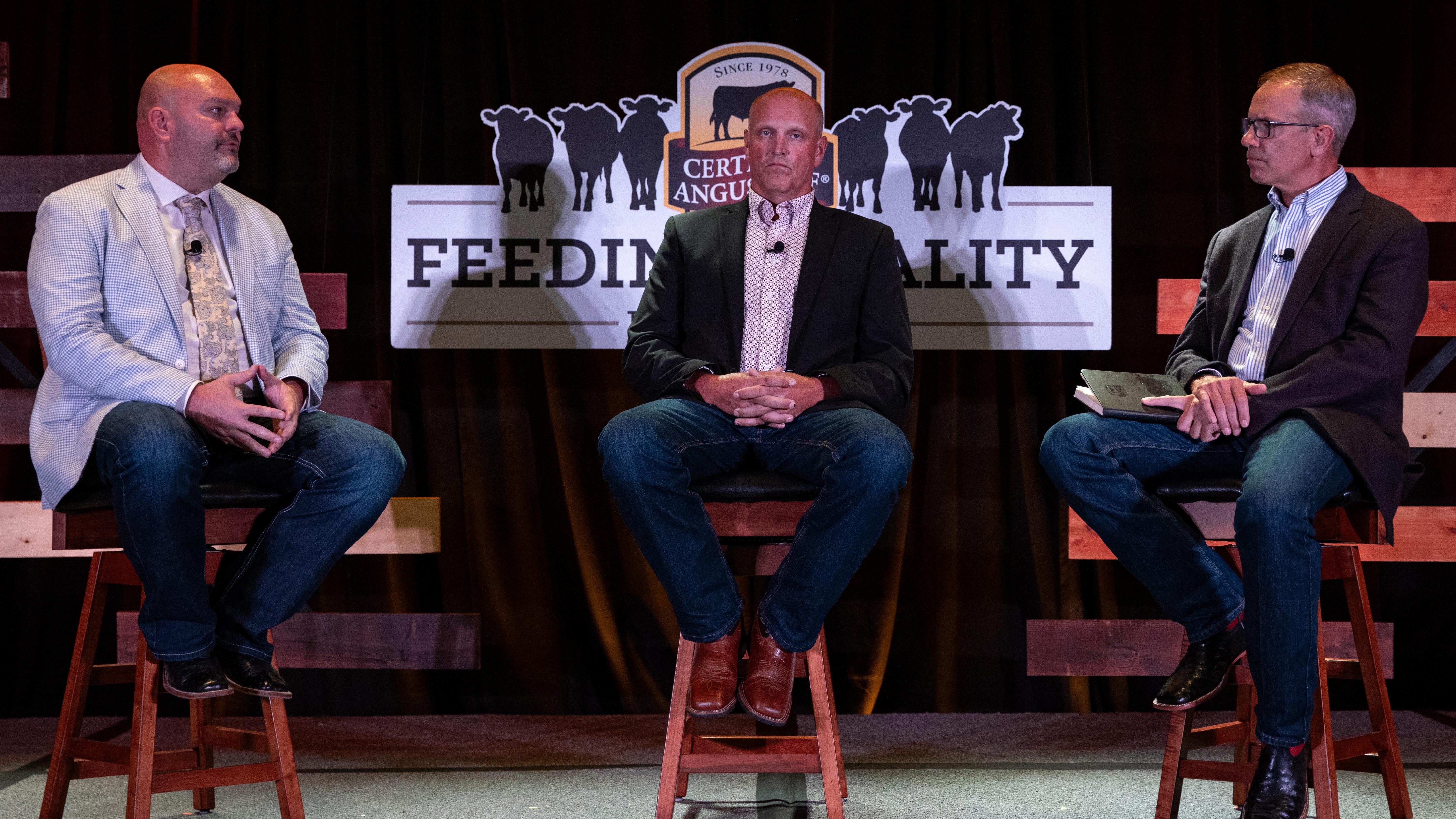 Certified Angus Beef’s (CAB) Paul Dykstra was joined by Dallas Knobloch, 4K Cattle LLC, and Travis Thomas, Upper Iowa Beef, for a panel discussion at the 2025 Feeding Quality Forum in Rochester, Minn., in August.