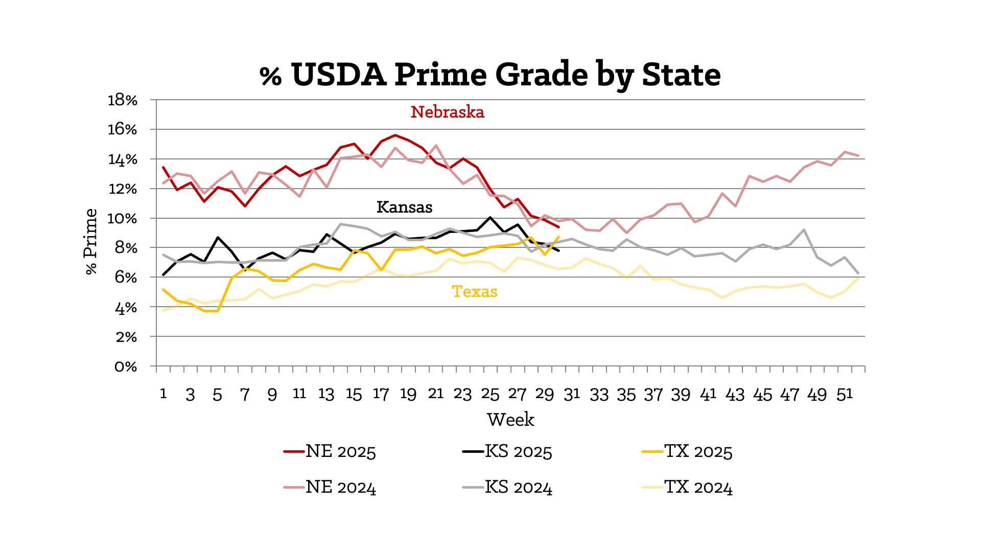 Northern states like Nebraska, Iowa and Minnesota lead in Prime carcass percentages in 2025 with Texas carcasses showing notable year-over-year improvement. Quality premiums are reflected regionally, with Iowa/Minnesota sharing $7.31 and Nebraska $6.75, respectively, August 2024 to August 2025, according to USDA data.
