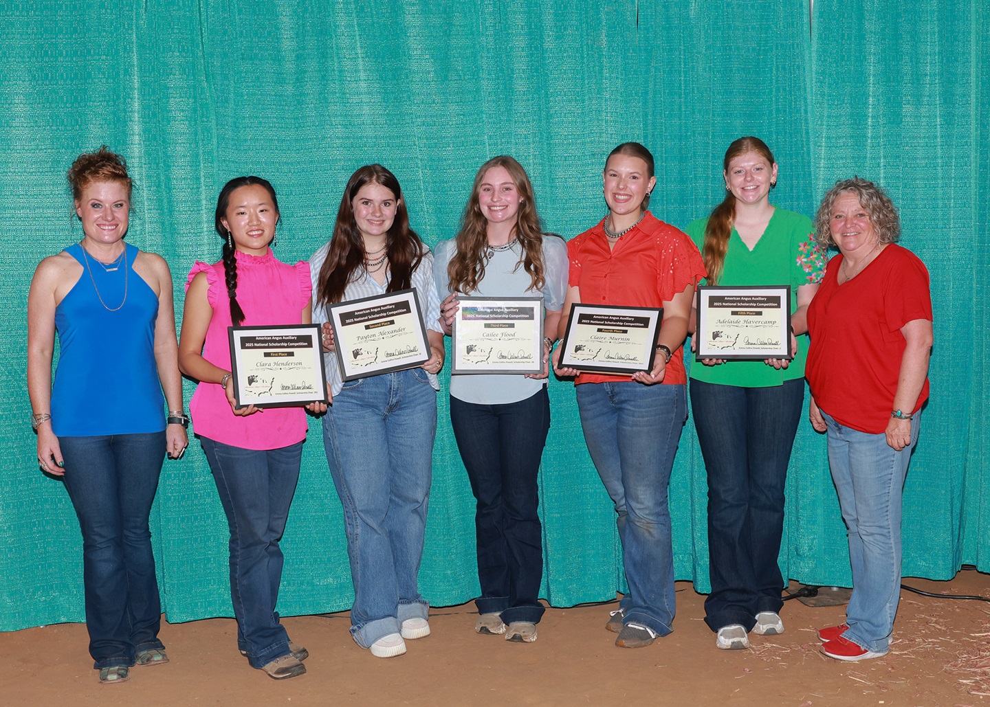 From left are Emma Collins Powell, American Angus Auxiliary president elect, presenting; Clara Henderson, East Troy, Wis., first; Payton Alexander, Nemo, Texas, second; Cailee Flood, Oakdale, Calif., third; Claire Murnin, Pompeys Pillar, Mont., fourth; Addie Havercamp, Bern, Kan., fifth; and Tonya Theis, American Angus Auxiliary president, presenting.