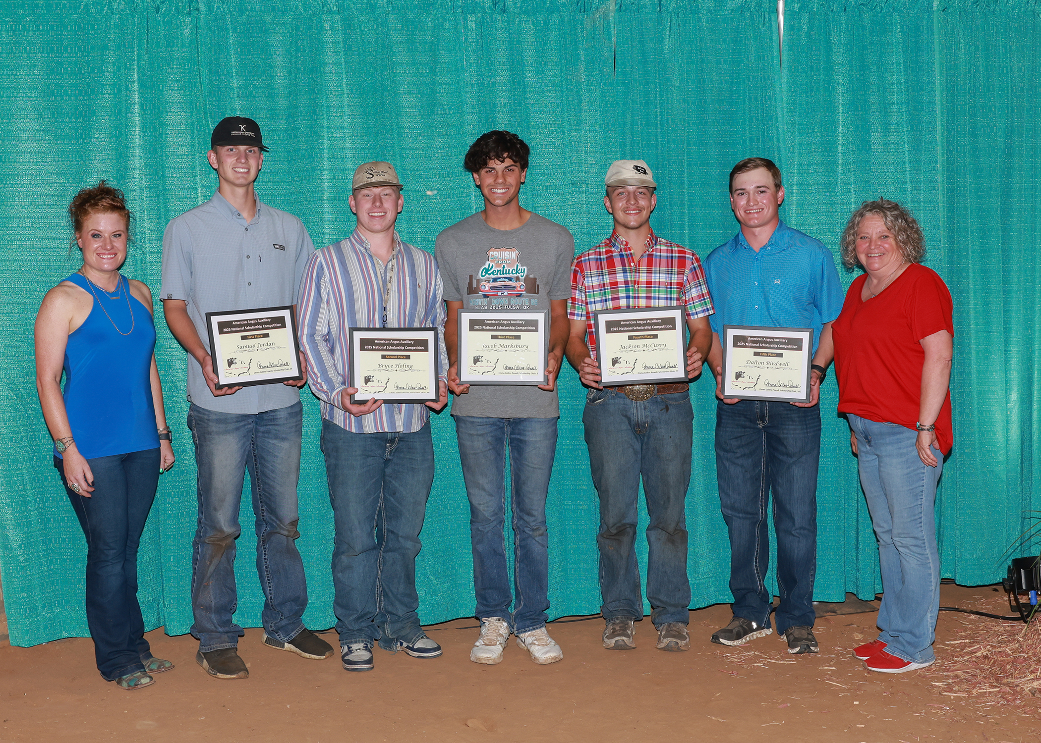 From left are Emma Collins Powell, American Angus Auxiliary president elect, presenting; Samual Jordan, Savannah, Mo., first; Bryce Hofing, Coatesville, Ind., second; Jacob Marksbury, Buffalo, Ky., third; Jackson McCurry, Colwich, Kan., fourth; Dalton Birdwell, Bryson, Texas, fifth; and Tonya Theis, American Angus Auxiliary president, presenting.