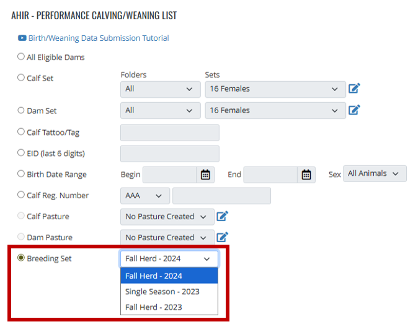 To use the most likely sire feature, you will need to select a specific breeding set (Figure 1). The breeding data set is the calving season and breeding year as specified when breeding data was submitted. When you select a breeding set, the list of dams to select from will only include females with a record in the set.
