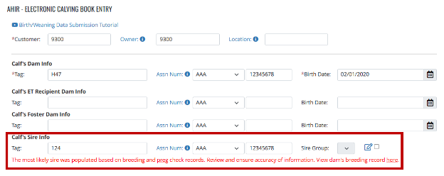 Even though the sire will be automatically populated, you can still edit this field. If you need to change the sire that is populated, you can edit the field prior to submitting the record to override the most likely sire that was selected.