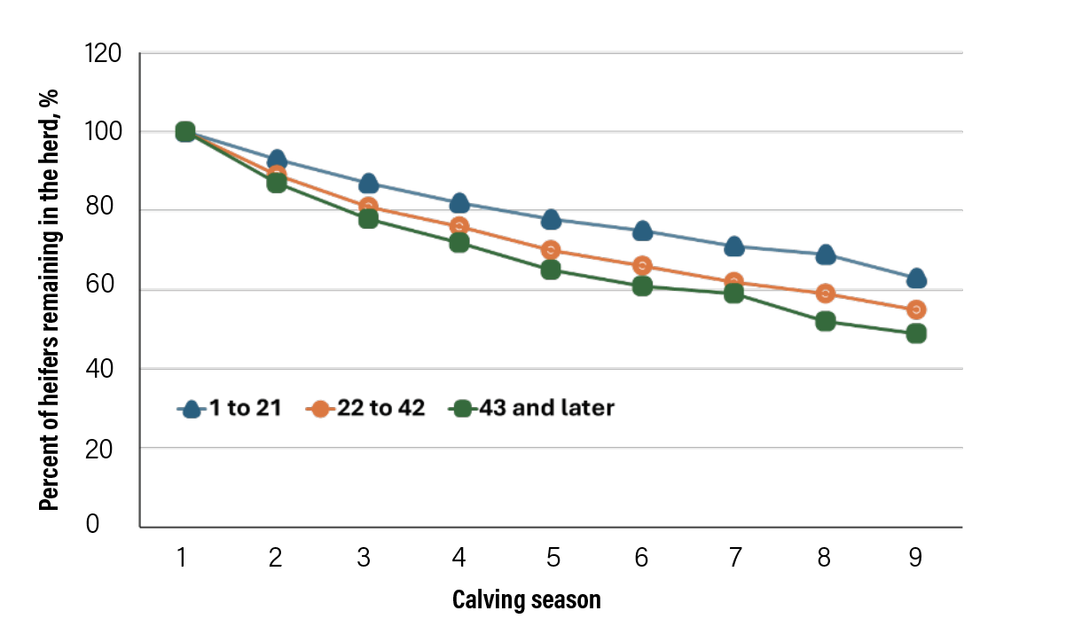 A study (Cushman et al., 2013) determined the longevity data collected on 16,549 individual heifers at the U.S. Meat Animal Research Center (USMARC). Data were limited to heifers that conceived during their first breeding season. Heifers were grouped into 21-day calving periods and were determined to have left the herd when they were diagnosed not pregnant at the end of the breeding season. Heifers that calved with their first calf during the first 21-day period of the calving season had increased longevity compared with heifers that calved in the second 21-day period or later (Figure 1).