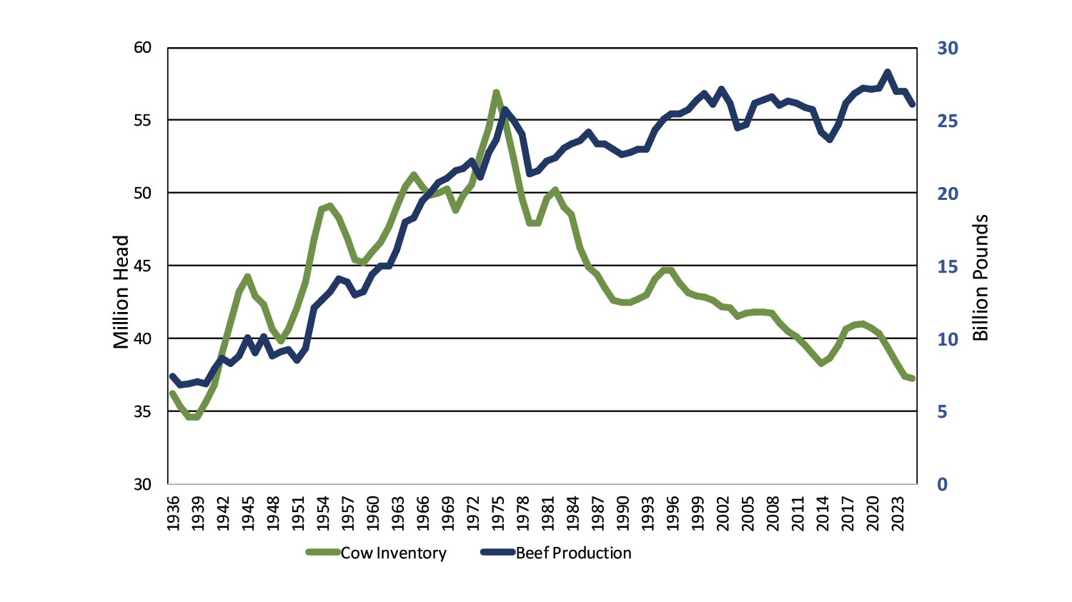 U.S. beef production reached an all-time record high of 28.36 billion lb. in 2022, buoyed by drought-forced beef cow liquidation. 2023 and 2024 beef production declined to 27 billion lb. with fewer cattle available.