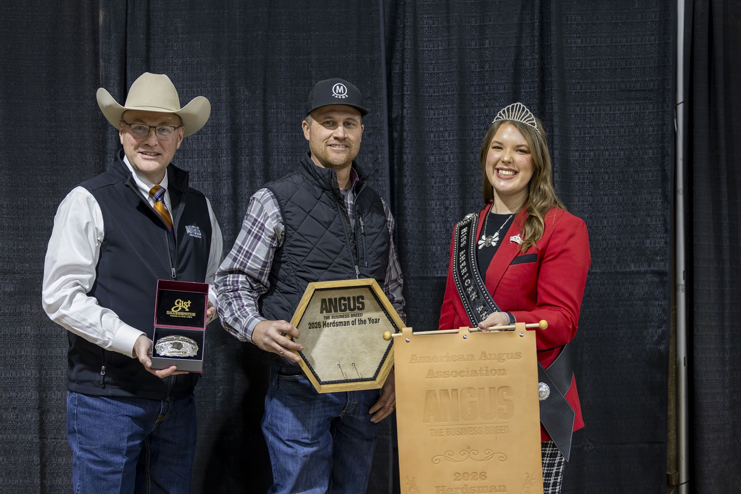 Craig Sand (center) was voted 2026 Angus Herdsman of the Year. Also pictured is Mark McCully (left), CEO of the American Angus Association, and Claire Murnin, Miss American Angus.