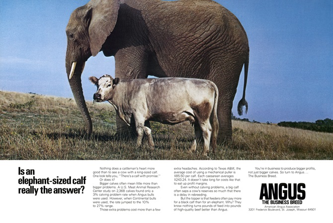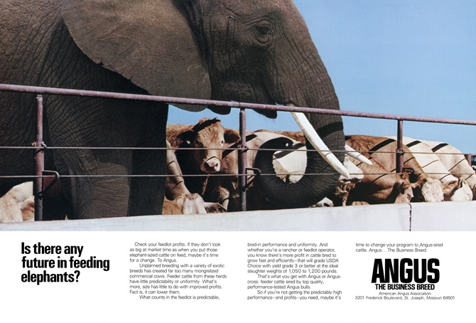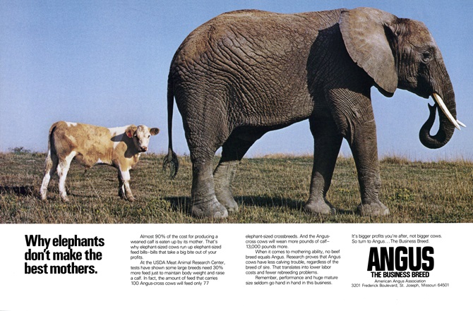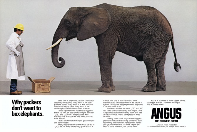 The most well-known of all those are the “elephant ads,” which are still talked about today. They aimed to get breeders thinking about frame size and the end-user, with taglines like, “Why packers don’t want to box elephants” and “Why elephants don’t make the best mothers.”