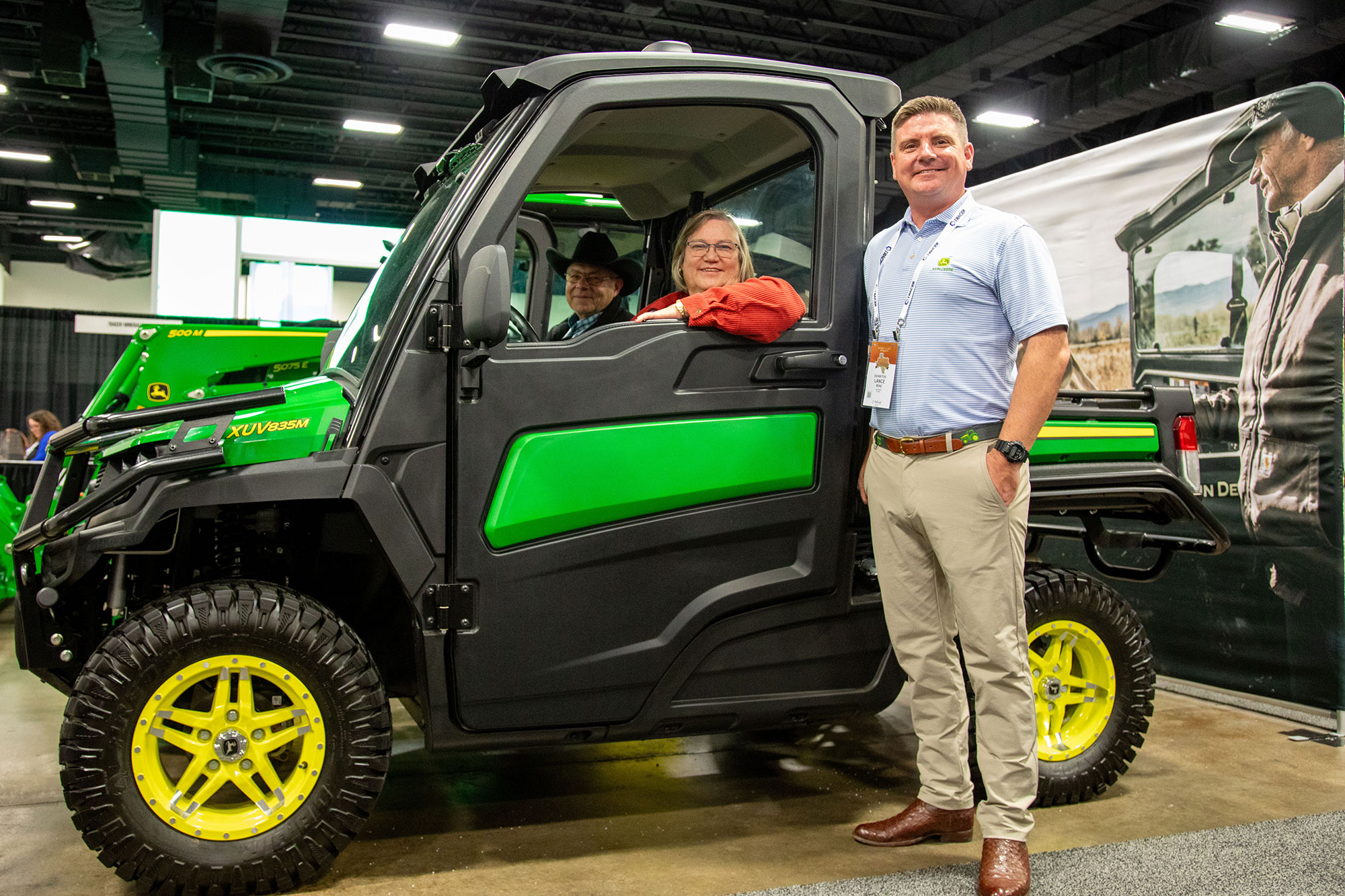 Cutline: Debbie Denowh of Montana was the winner of a John Deere XUV835M Gator at the Angus Convention in Ft. Worth. Pictured from left are Michael and Debbie Denowh, and Lance Benz, John Deere representative.