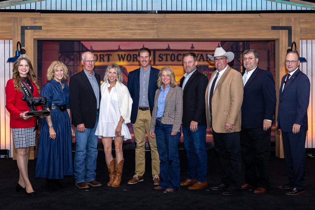 Cutline: Connealy Craftsman owned by Select Sires Inc., Plain City, Ohio, and Sexing Technologies, Navasota, Texas, sired 4,014 calves registered into the Angus herd book, the most in fiscal year 2024. Pictured from left are Lauren Wolter, Miss American Angus; Sharon, Jerry, Hannah, and Gabriel Connealy of Connealy Angus Ranch; Lorna Marshall and David Thorbahn of Select Sires Inc.; Aaron Arnett, and Juan Moreno of STgenetics; and Mark McCully, American Angus Association CEO.