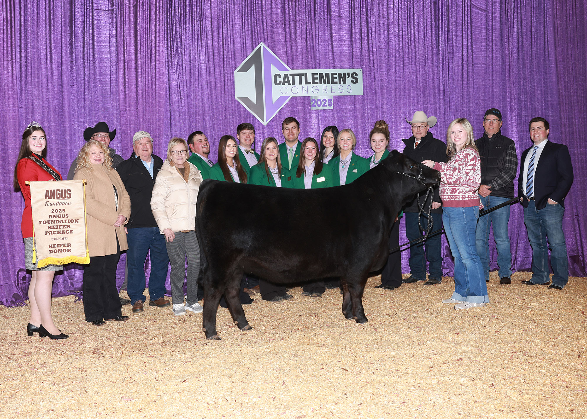 Cutline: The 2025 Angus Foundation Heifer Package, donated by Pollard Farms of Waukomis, Oklahoma, was purchased by Lylester Ranch of Martell, Nebraska, for $75,000 on January 10 at Cattlemen’s Congress in Oklahoma City.