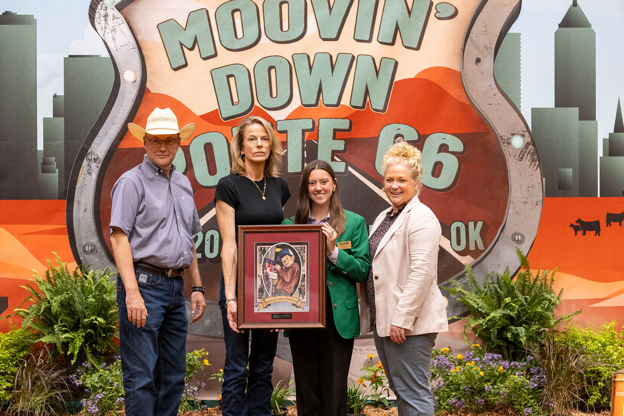 Cutline: Jarold and Jennifer Callahan of Yukon, Oklahoma, were recognized as 2025 Honorary Angus Foundation Inductees at the 2025 National Junior Angus Show in Tulsa,Olka. Pictured from left are Mark McCully, American Angus Association chief executive officer; Jennifer Callahan, Honorary Angus Foundation Inductee; Alli Perry NJAA Foundation director; and Jaclyn Boester, Angus Foundation executive director.