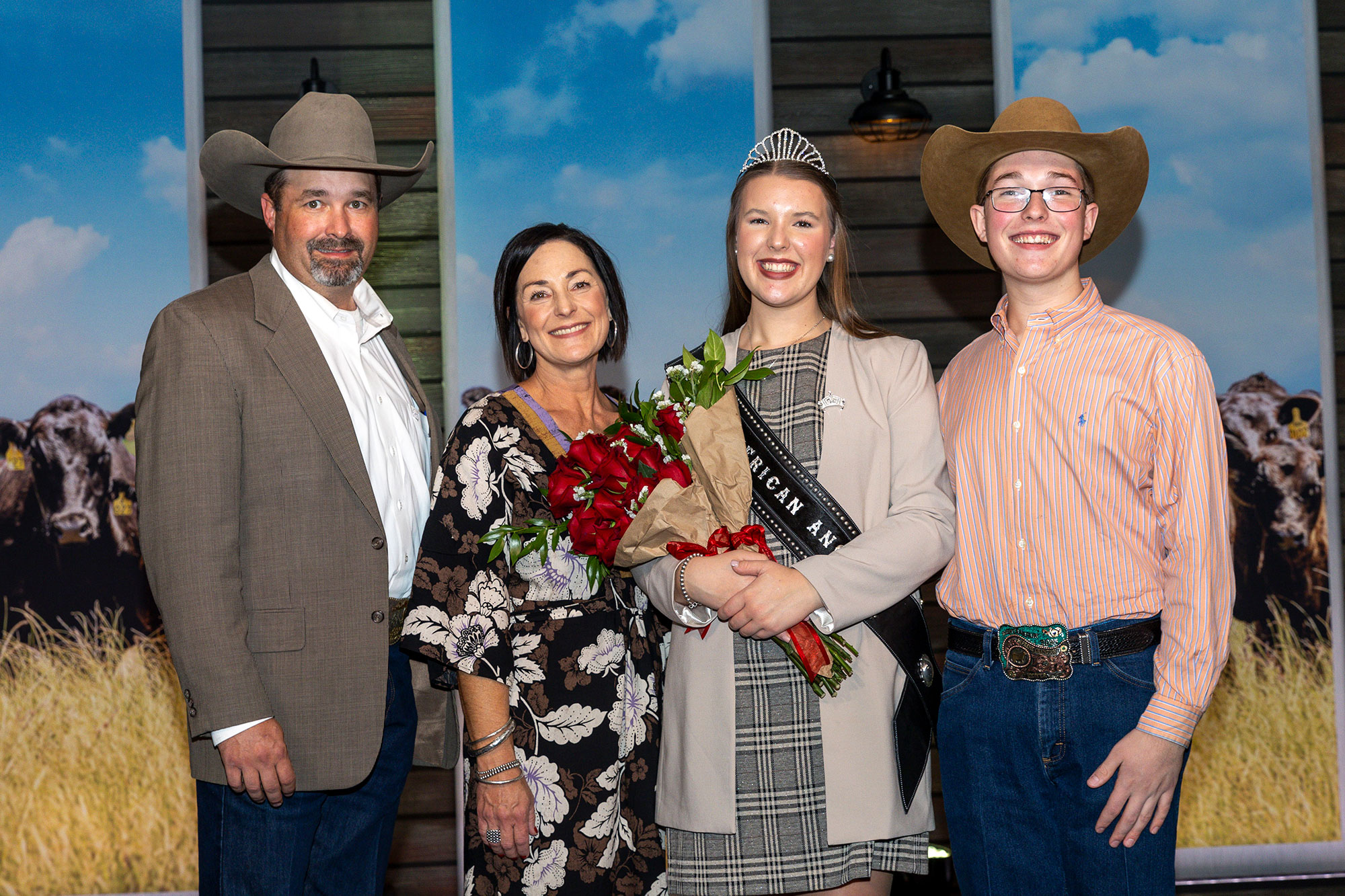 Cutline: The Murnin family stands alongside their daughter, Claire, as she is crowned the 2025 Miss American Angus. Pictured left to right are Jared, Julie, Claire, and Cooper Murnin.