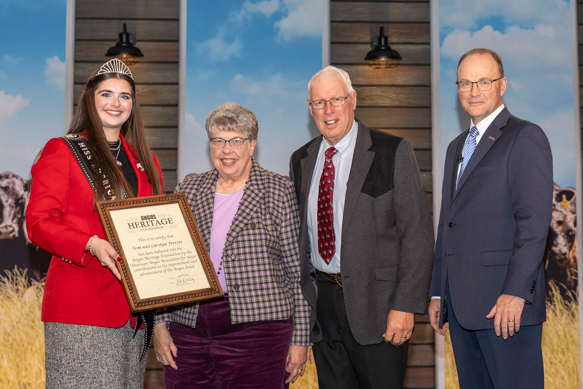 Pictured from left are Rosalind Kidwell, 2025 Miss American Angus; Carolyn and Tom Perrier; and Mark McCully, American Angus Association CEO.