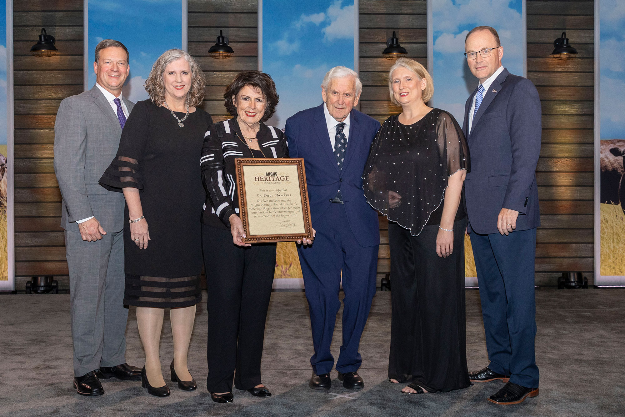 Pictured from left are Dan and Lisa Moser, son-in-law and daughter; Kathleen Hawkins, wife; Dr. David Hawkins; Jennifer Hawkins, daughter; and Mark McCully, American Angus Association CEO.