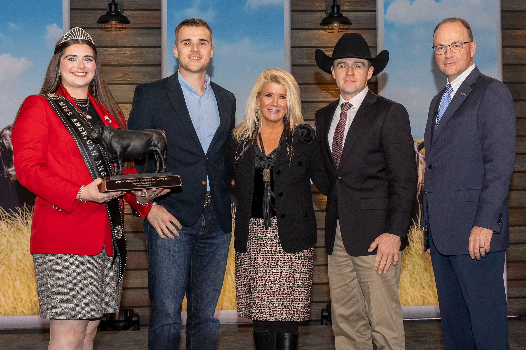 Cutline: FITZGERALD Saint Elmo 1997 owned by Broderic Fitzgerald of Frankfort, Indiana, was named ROV Show Bull of the Year at the 2025 Angus Convention Awards Dinner in Kansas City, Missouri. Pictured from left are Miss American Angus Rosalind Kidwell; Broderic’s brother, Bryce Fitzgerald, his mom Andi Clock Fitzgerald and Broderic Fitzgerald and Mark McCully, American Angus Association CEO.