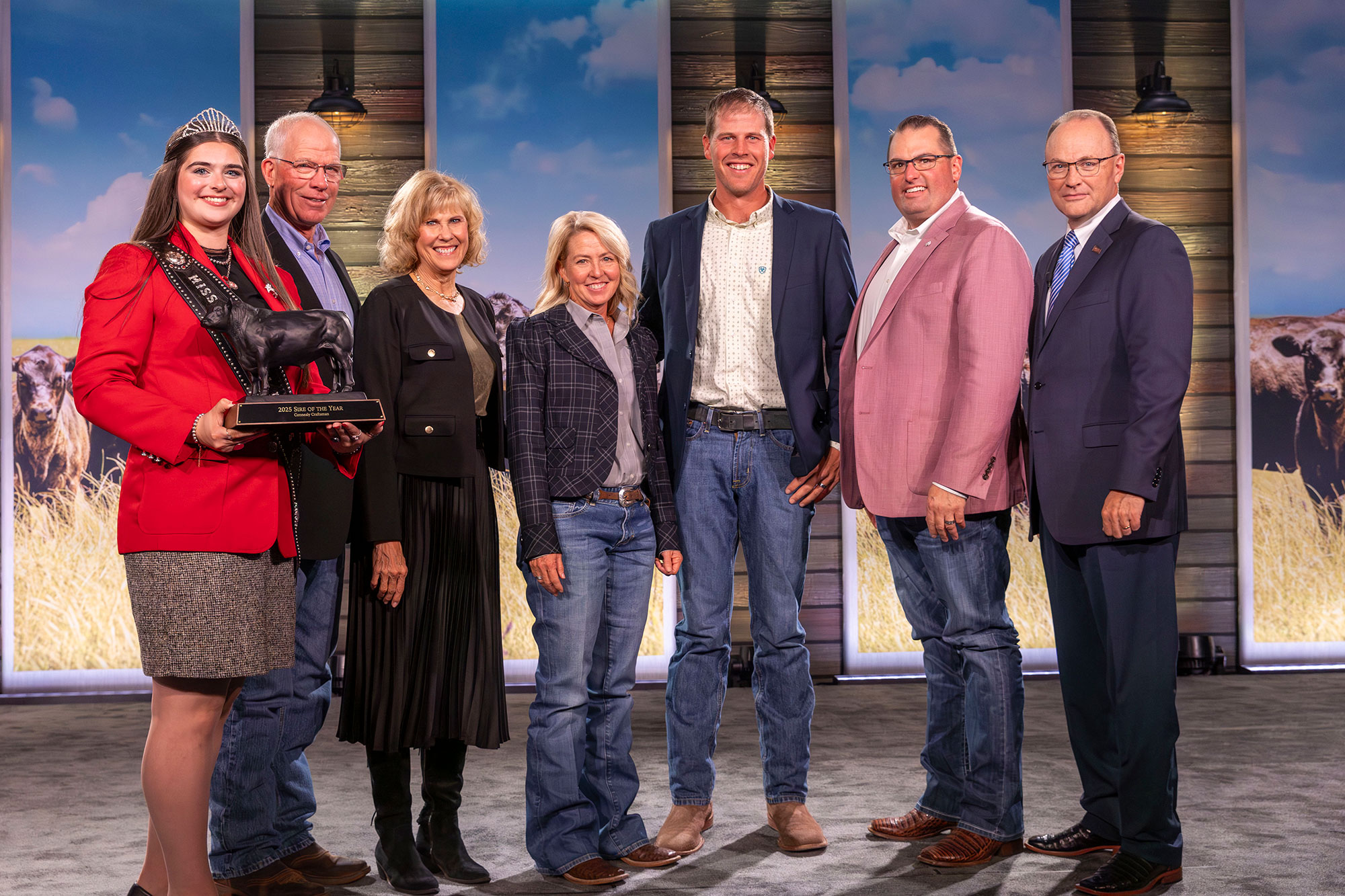 Cutline: Connealy Craftsman owned by Select Sires Inc., Plain City, Ohio, and Sexing Technologies, Navasota, Texas, sired 6,148 calves registered into the Angus herd book, the most of any in fiscal year 2025. Pictured from left are Rosalind Kidwell, Miss American Angus; Sharon and Jerry, Connealy of Connealy Angus Ranch; Lorna Marshall, Select Sires Inc.; Gabriel Connealy, Connealy Angus Ranch; Aaron Arnett, STgenetics; and Mark McCully, American Angus Association CEO.