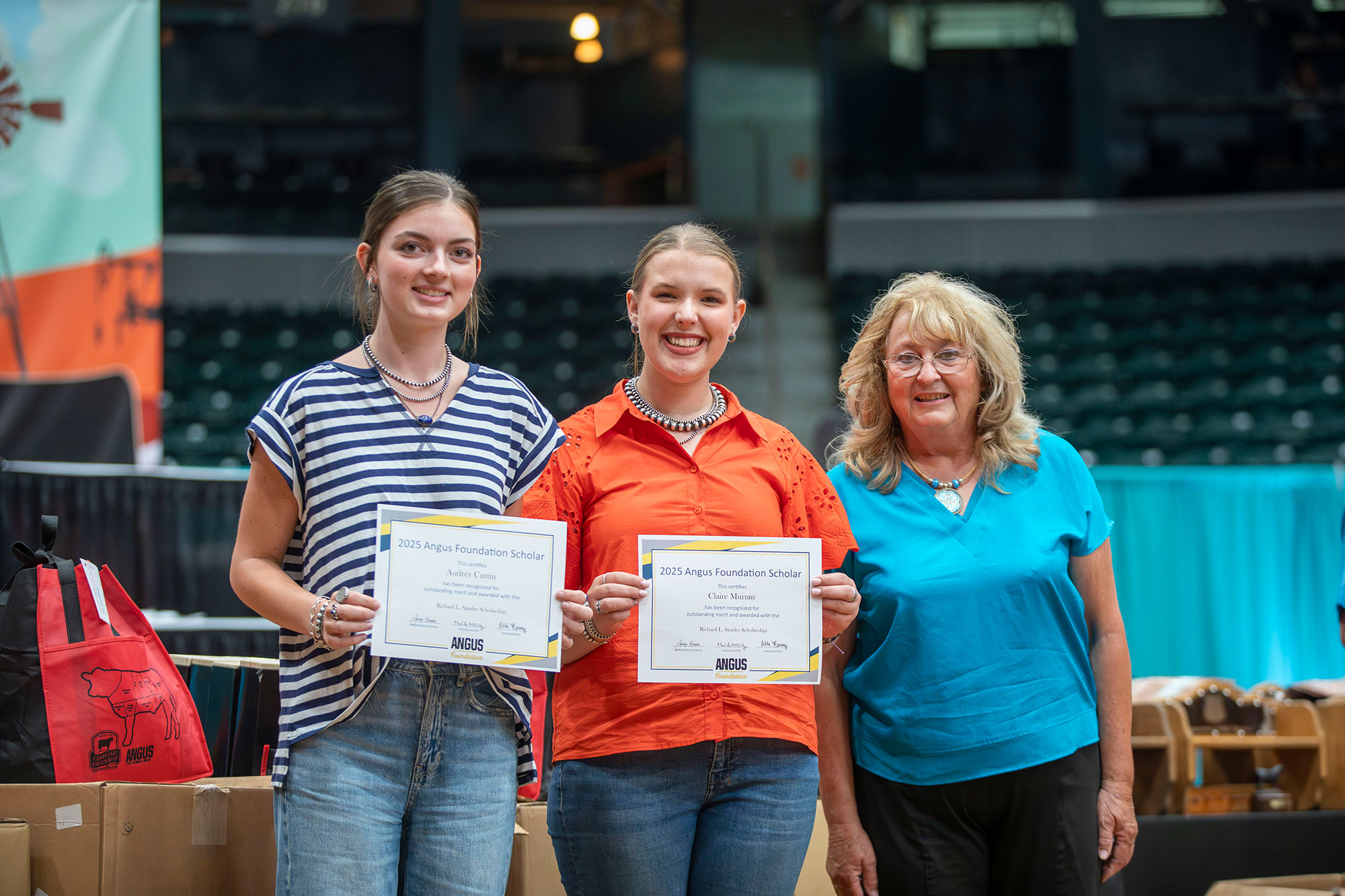 Cutline: Audry Curtin of Illinois and Claire Murnin of Montana accept the Richard L. Spader Angus Foundation Scholarship from Sheri Spader at the National Junior Angus Show in Tulsa, Oklahoma. The Foundation awarded more than $393,000 in scholarships in 2025.