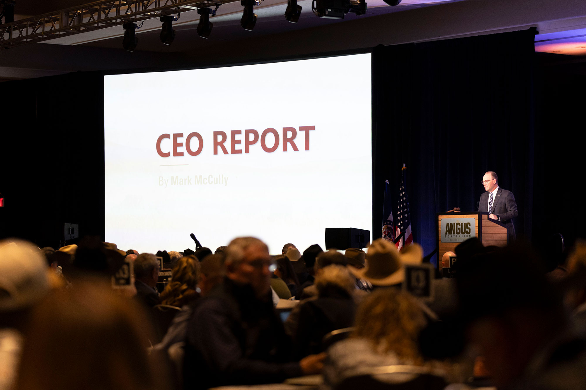 Cutline: 2025 Angus Convention attendees listen to the American Angus Association® CEO Report given by Mark McCully during the 142nd Convention of Delegates in Kansas City on Sunday, Nov. 2.