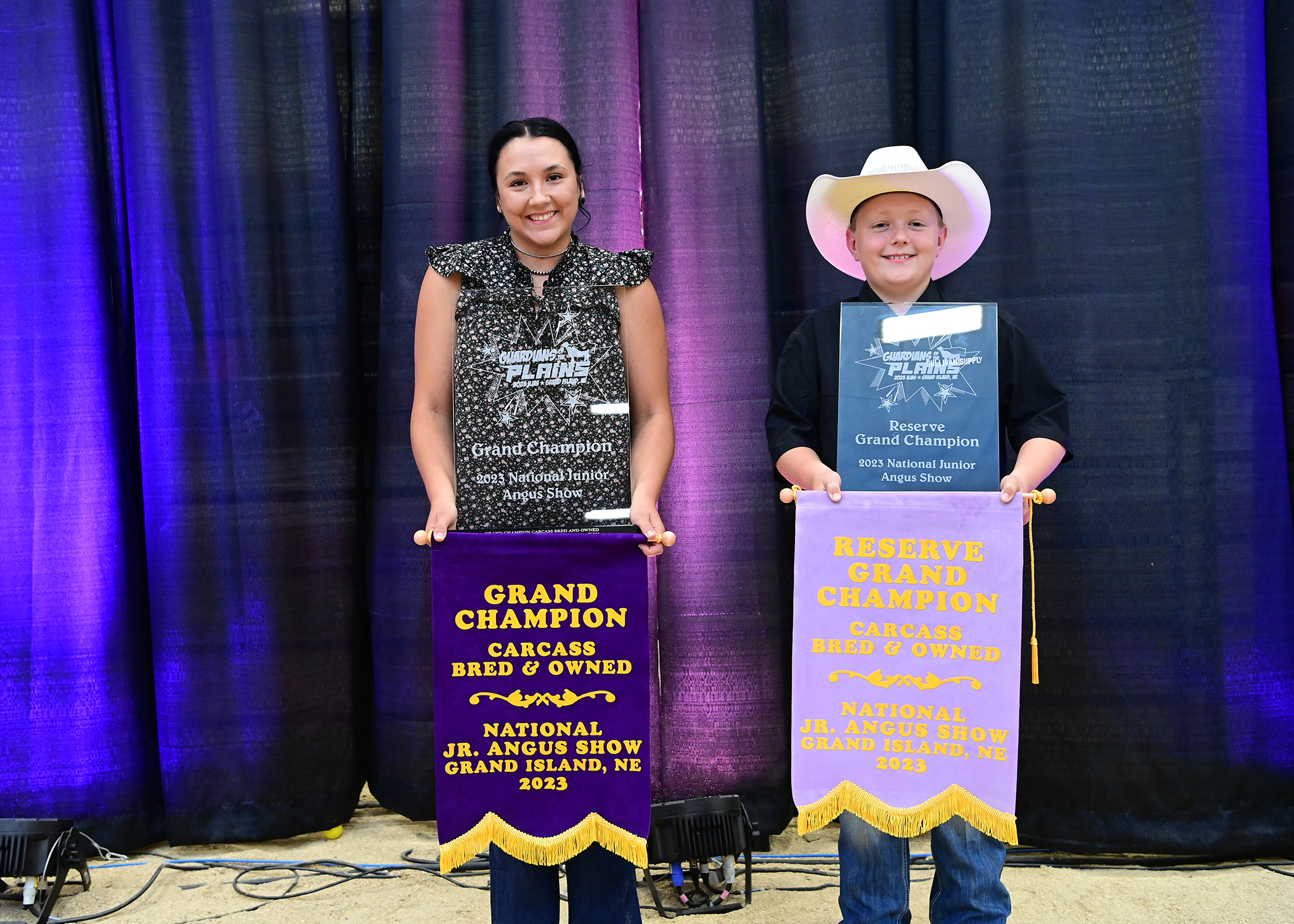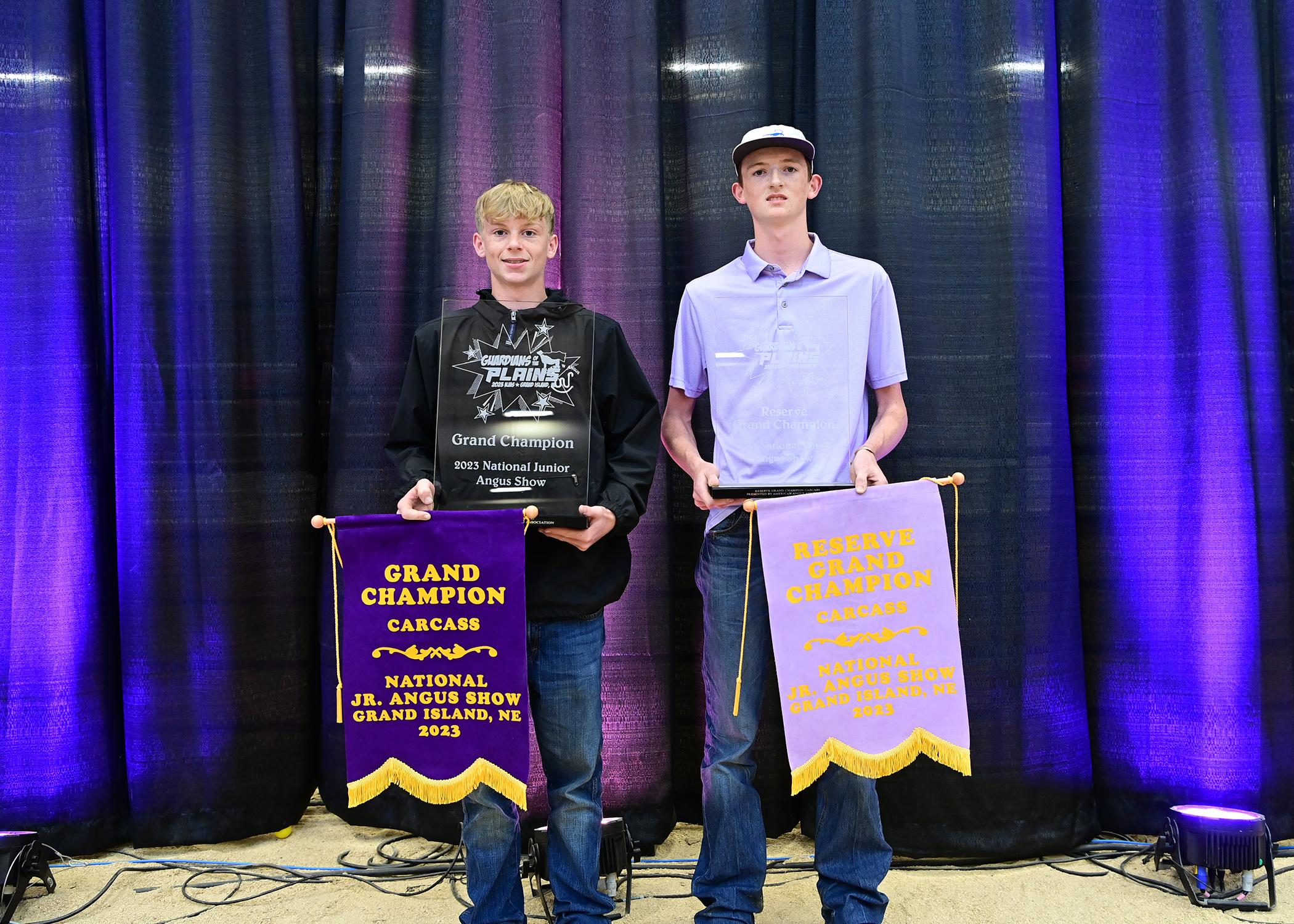 Cutline: Brazos Worrell was awarded champion carcass steer and Owen Austrino was awarded reserve carcass steer at the 2023 National Junior Angus Show in Grand Island, Neb. Pictured from left are Owen Austrino, Dade City, Fla., and Pecos Worrell, accepting on behalf of Brazos Worrell, Harper, Texas.