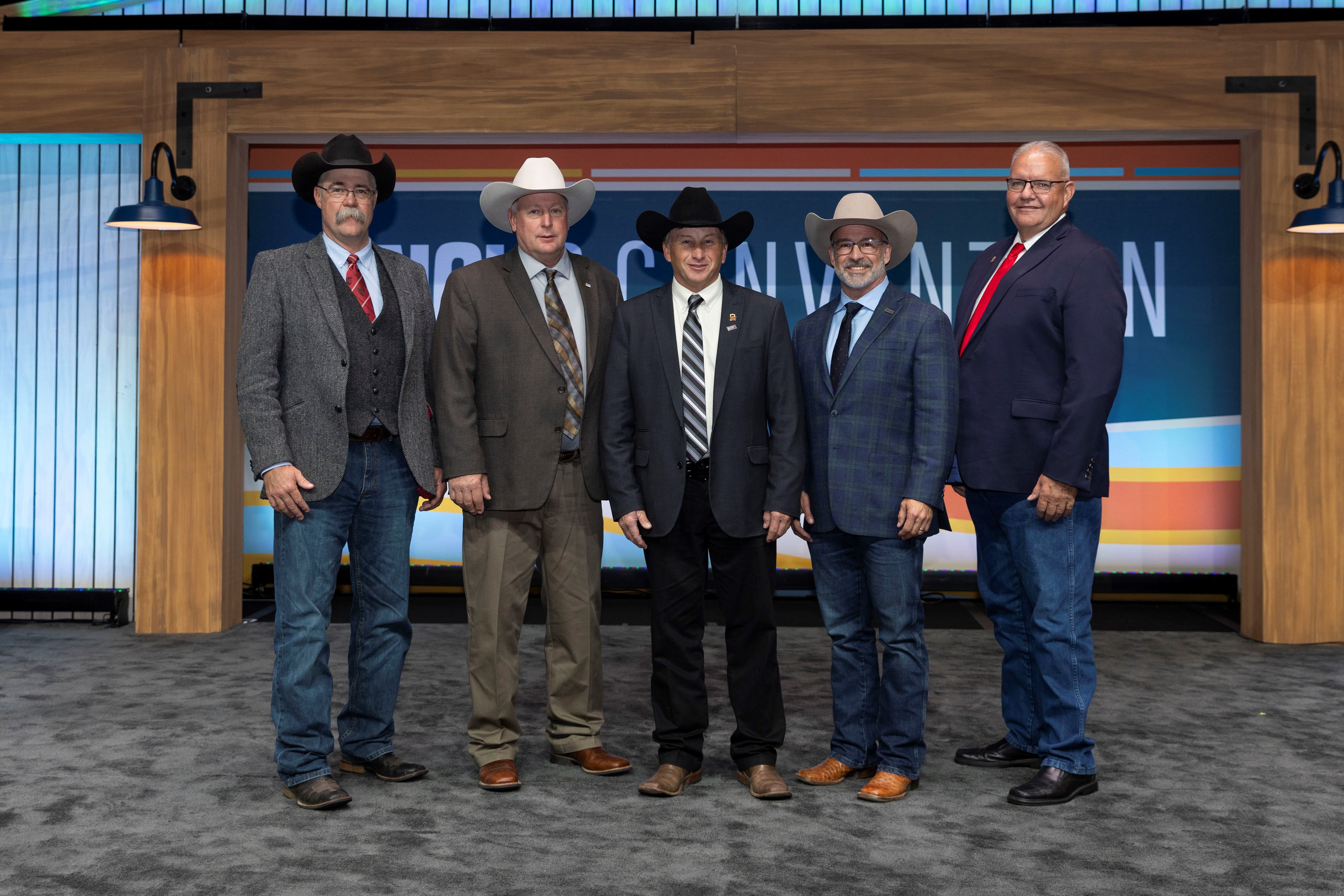 Cutline: The newly re-elected 2023-2024 American Angus Association® board members pictured from left to right: Darrell Stevenson, Charles Mogck, Jerry Theis, Smitty Lamb and Mark Ahearn.