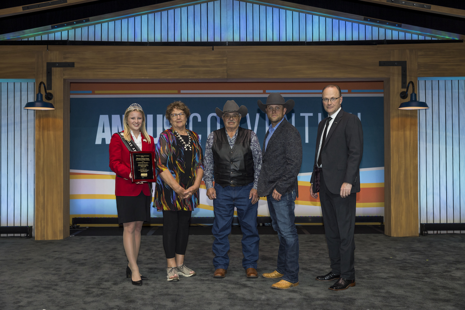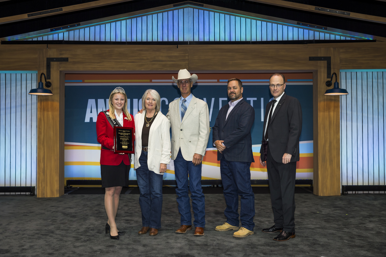 Cutline: Mike Sitz Angus Ranch was awarded the American Angus Association Century Award at the 2023 Angus Convention. Pictured from left are Kelsey Theis, 2023 Miss American Angus; Debra Sitz; Mike Sitz; Jesse Sitz; and Mark McCully, American Angus Association CEO.