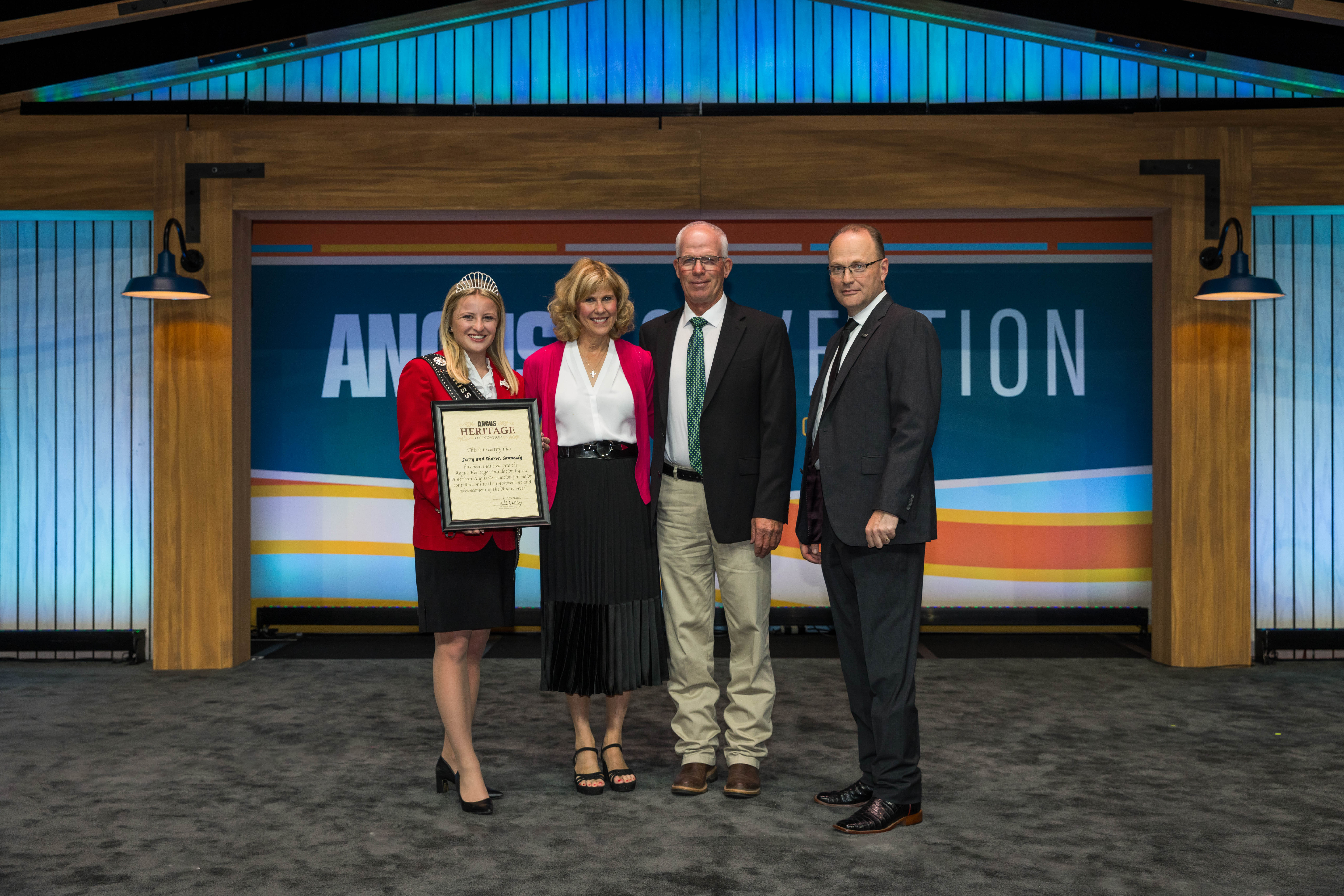 Cutline: Jerry and Sharon Connealy, Whitman, Neb., were inducted into the Angus Heritage Foundation at the 2023 Angus Convention in Orlando, Fla. Pictured from left are Kelsey Theis, 2023 Miss American Angus; Sharon Connealy; Jerry Connealy; and Mark McCully, American Angus Association CEO.