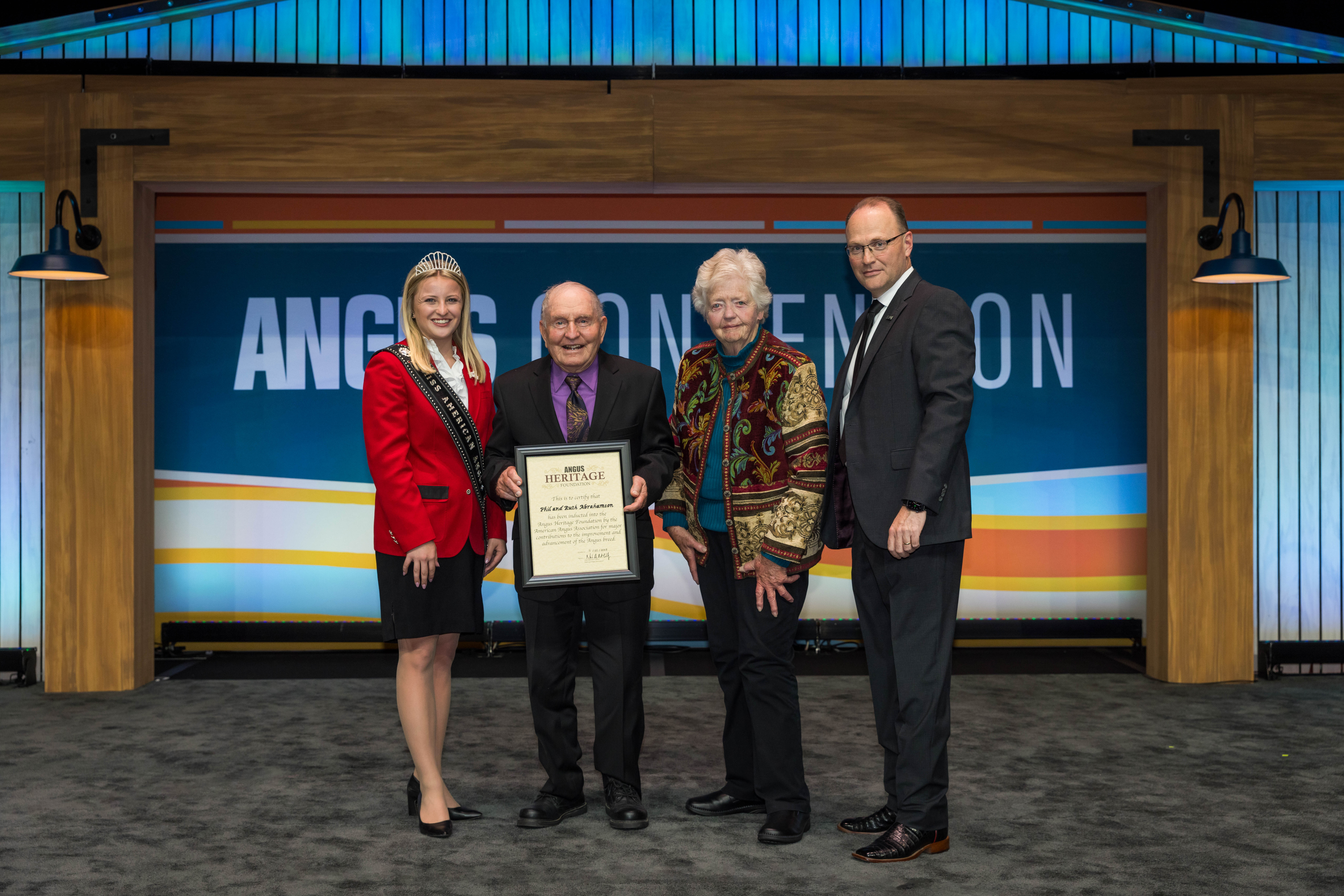 Cutline: Phil and Ruth Abrahamson, Lanesboro, Minn., were inducted into the Angus Heritage Foundation at the 2023 Angus Convention in Orlando, Fla. Pictured from left are Kelsey Theis, 2023 Miss American Angus; Phil Abrahamson; Ruth Abrahamson; and Mark McCully, American Angus Association CEO.