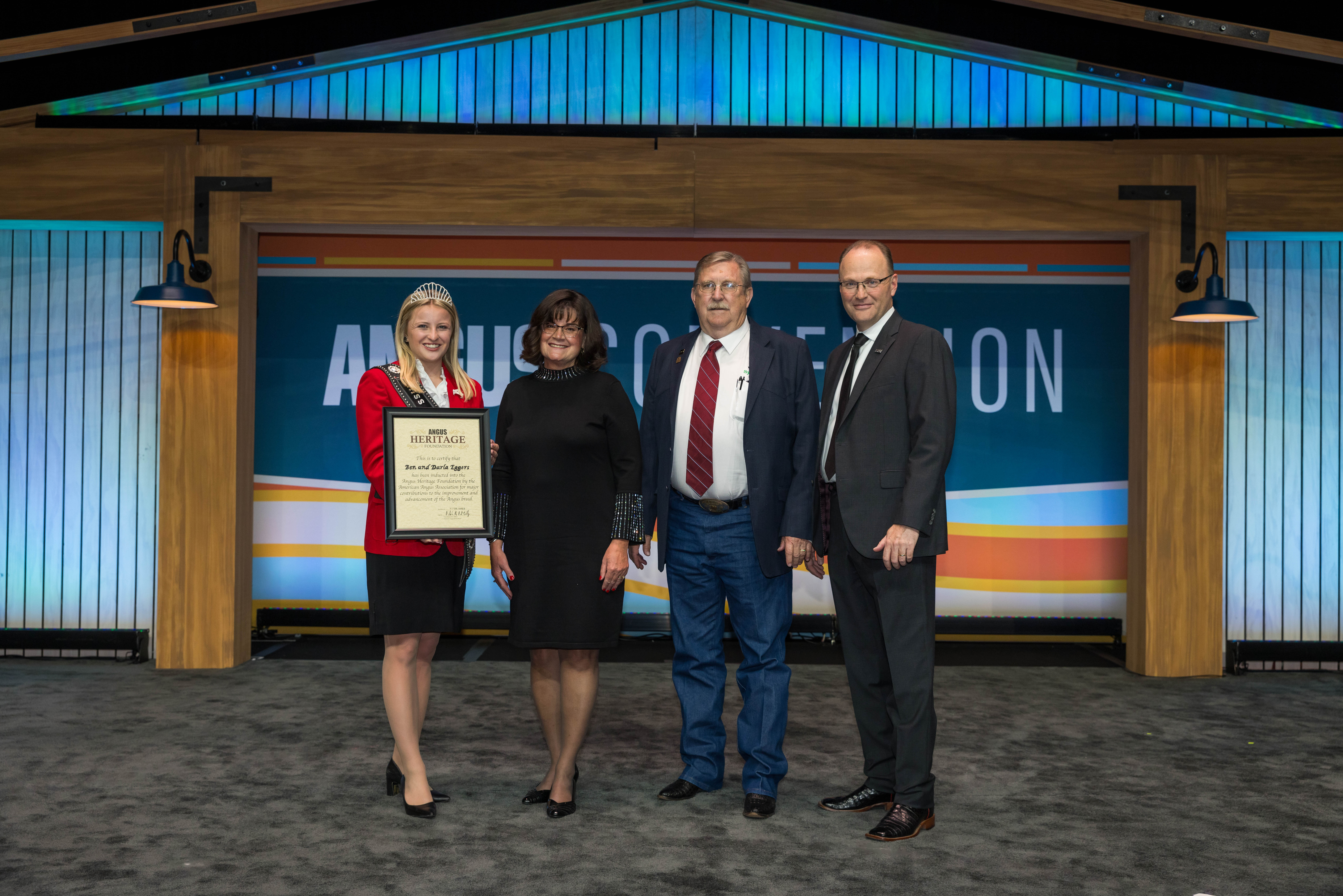 Cutline: Ben and Darla Eggers, Mexico, Mo., were inducted into the Angus Heritage Foundation at the 2023 Angus Convention in Orlando, Fla. Pictured from left are Kelsey Theis, 2023 Miss American Angus; Darla Eggers; Ben Eggers; and Mark McCully, American Angus Association CEO.