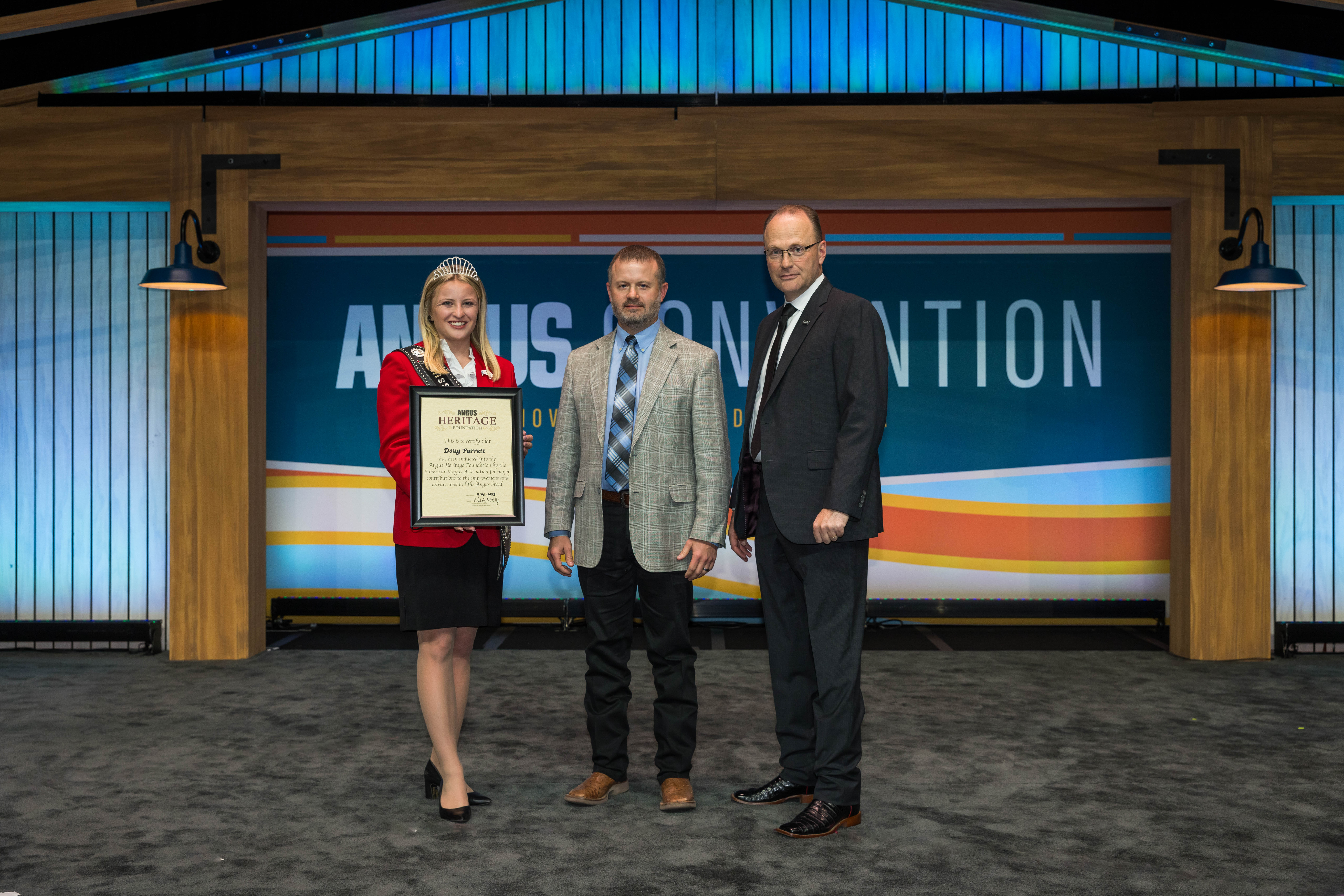 Cutline: Doug Parrett, Champaign, Ill., was inducted, posthumously, into the Angus Heritage Foundation at the 2023 Angus Convention in Orlando, Fla. Pictured from left are Kelsey Theis, 2023 Miss American Angus; Dan Shike, accepting the award; and Mark McCully, American Angus Association CEO.