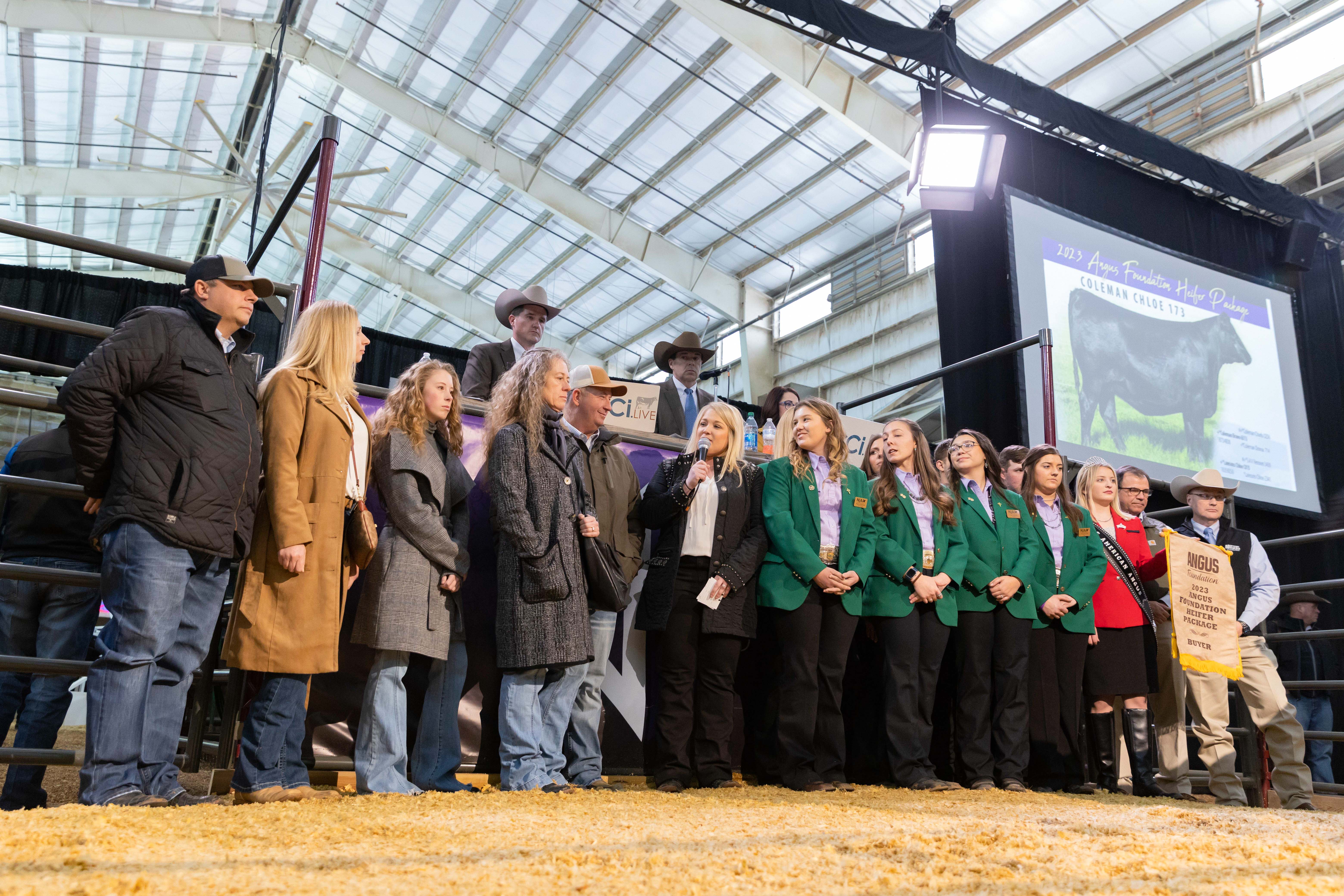 Cutline: Jaclyn Boester, Angus Foundation executive director, introduces the 2023 Angus Foundation Heifer Package donor, Coleman Angus of Charlo, Mont., at the National Angus Bull Sale in Oklahoma City. January brings several opportunities to support the Angus Foundation, including the 2024 heifer package donated by Yon Family Farms of Ridge Spring, S.C.