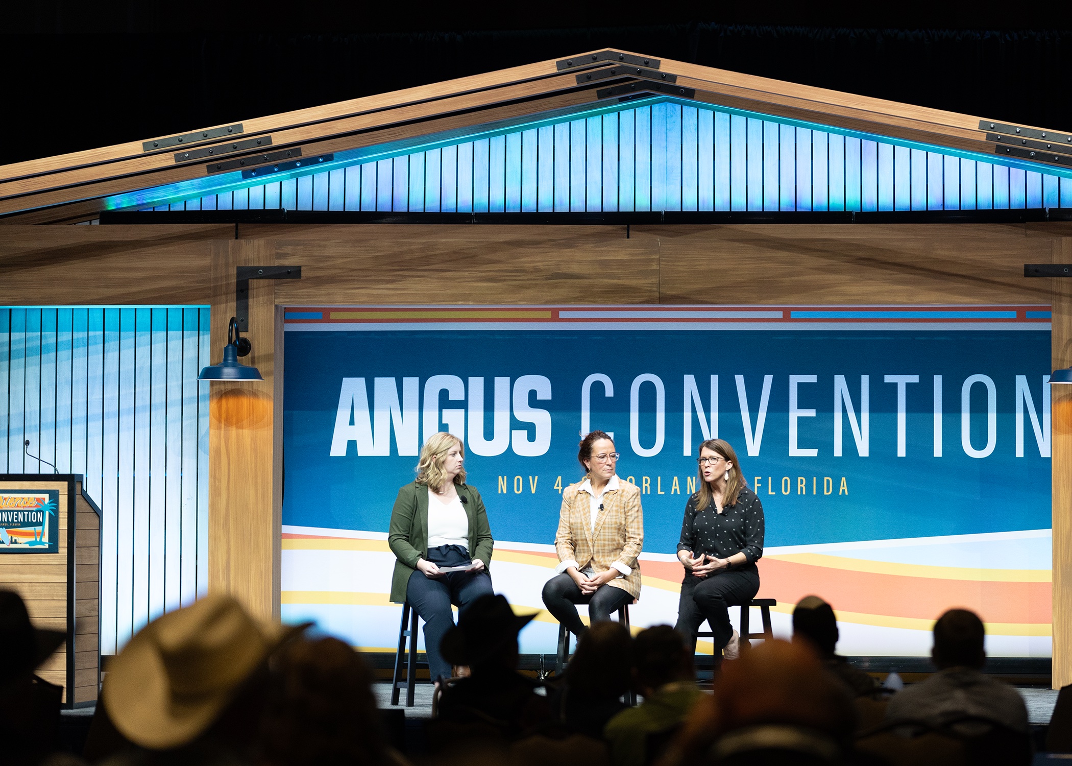 Cutline: From left, Kelli Retallick-Riley, AGI®; Debbie Plouffe, Center for Aquaculture Technologies; and Kristin Brogaard, Inherent Biosciences, present during the second general session of the 2023 Angus Convention held in Orlando, Fla., Nov. 3-6.